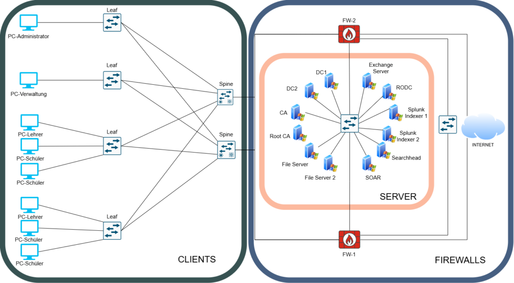 Ein digitaler Zwilling des Schulnetzwerks wird erstellt und nach Industrienormen abgesichert. Durch gehärtete Komponenten wie Firewalls, Switches und Server wird die Netzwerksicherheit verbessert.